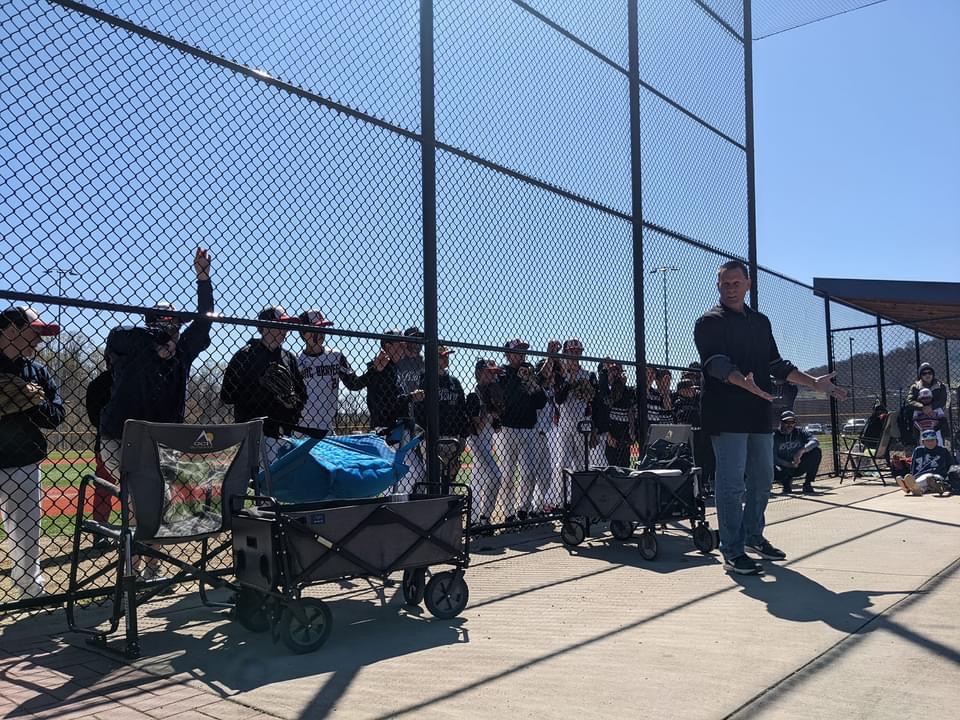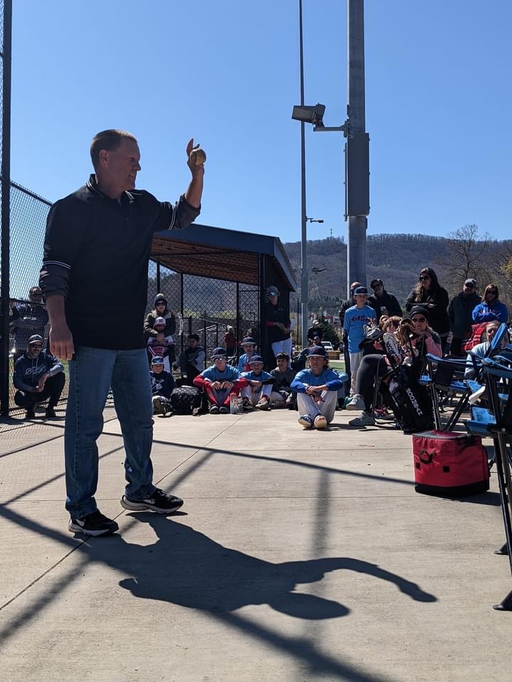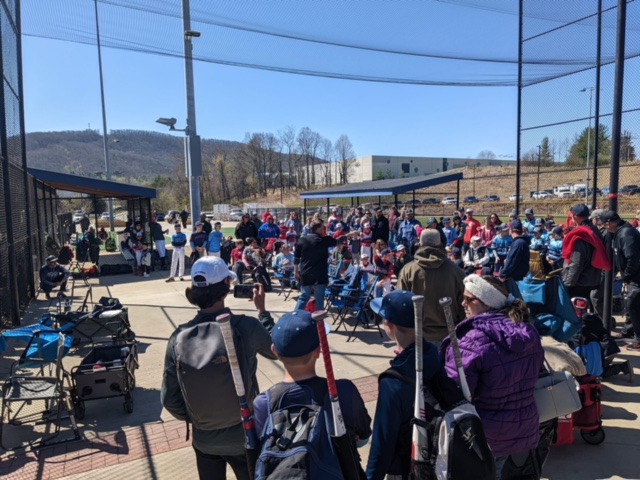 This weekend, we welcomed teams from Asheville, Hendersonville, Candler, Waxhaw, Spartanburg and Knoxville! Pictured below: Lyn Milner holding devotions Sunday morning at Bob Lewis Ballpark with approximately 200 players, parents and fans at USSSA Baseball’s Diamond Invitational tournament, April 9-10.