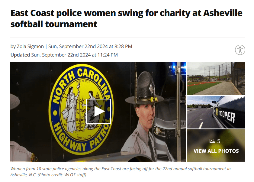 22nd Annual East Coast State Police Women’s Charity Softball Tournament Posted on September 21, 2024September 24, 2024 by Bob Lewis Ballpark Watch ABC NEWS 13 WLOS Interview with Major Kimberley Brown of the North Carolina State Highway Patrol PHOTO GALLERY Click on any image to view as Slideshow. Related Published by Bob Lewis Ballpark View all posts by Bob Lewis Ballpark